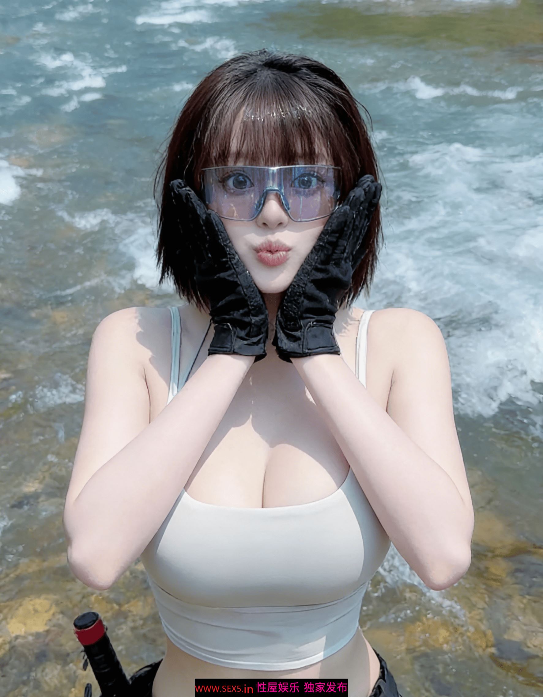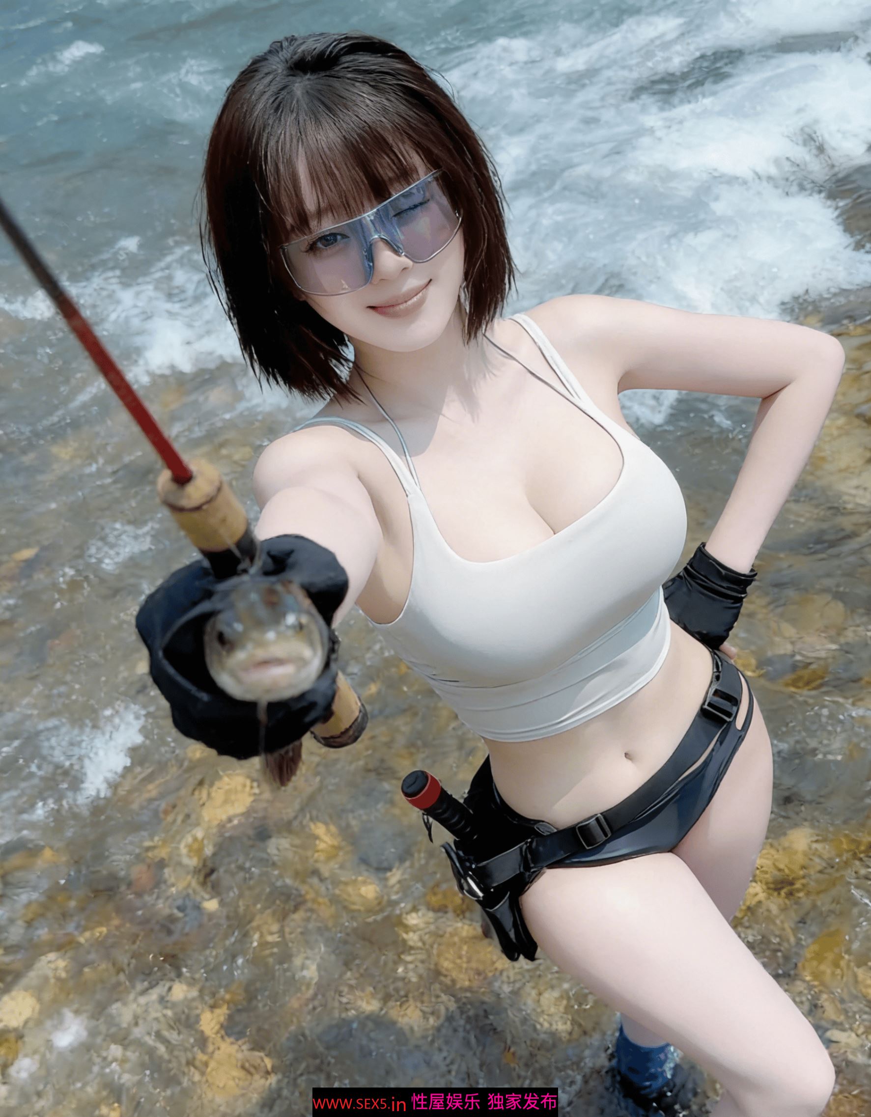 溪水漫过脚踝的清凉,抵不过她半跪在水里的热辣。她握着鱼竿的手戴着黑手套,钩子上挂着刚上钩的鱼,可所有人的视线,都钉在她绷紧的白色背心上。