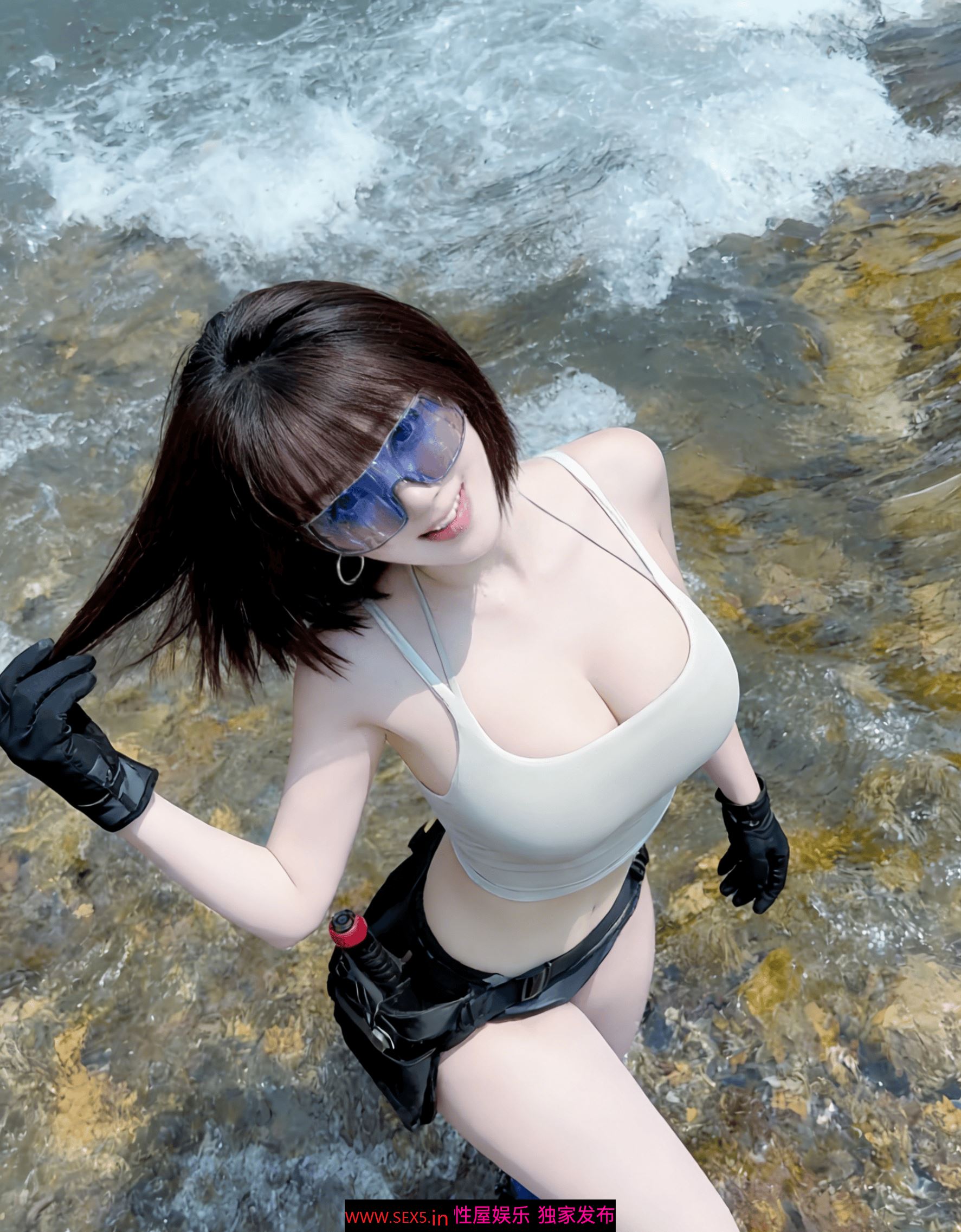 细肩带陷在细腻的肌肤里,背心被饱满的曲线撑得快要炸开,随着俯身的动作,腰腹的线条绷出流畅的弧度,马甲线在水光里若隐若现。黑色短裤被溪水打湿,紧贴着翘臀,布料下的轮廓清晰得让人喉结发紧,她微微屈膝的姿势,让大腿的线条绷出性感的张力,水珠顺着肌肤滑进短裤边缘,每一滴都像是在点火。